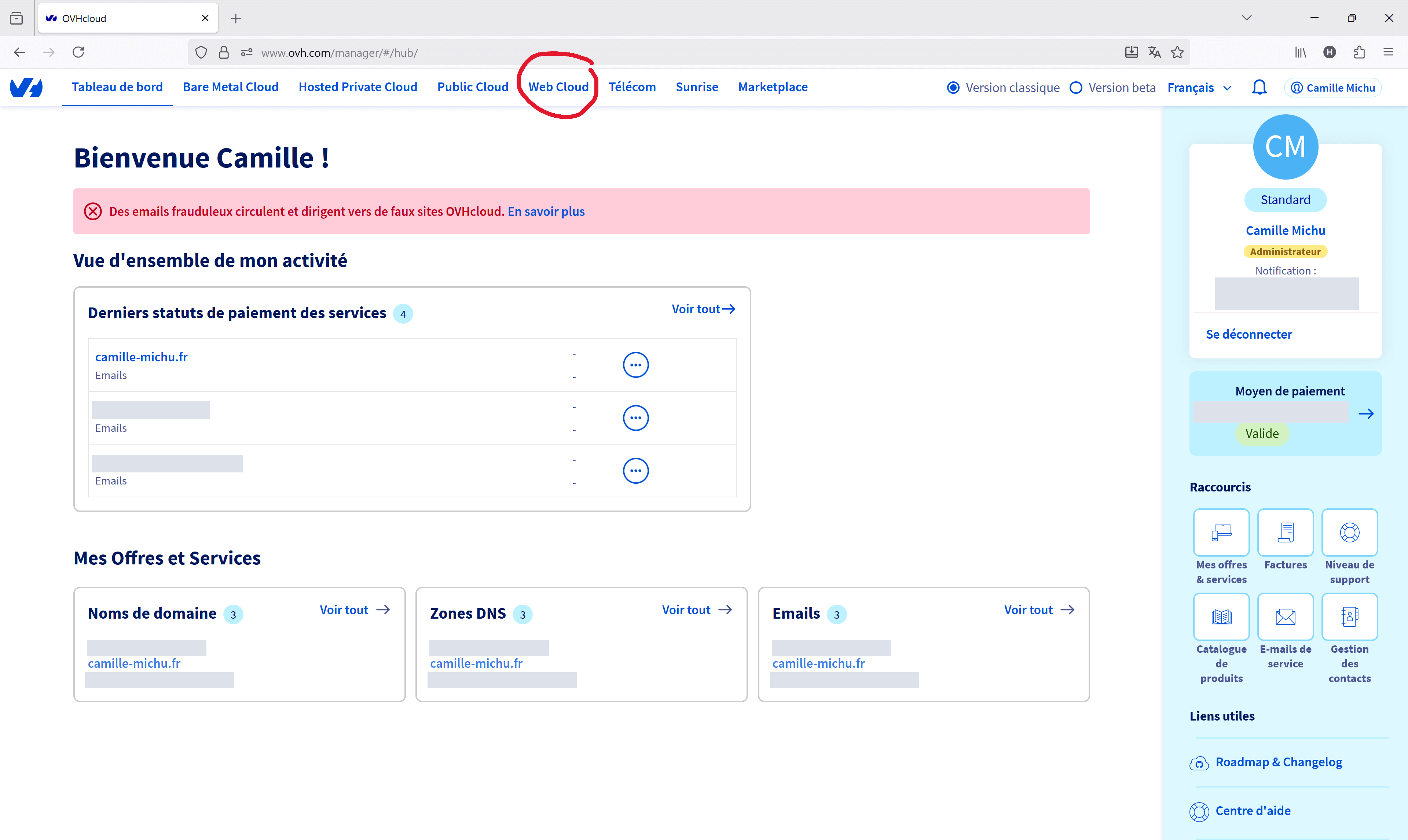 Rendez-vous d'abord dans votre espace utilisateur OVH et cliquez sur "Web Cloud" dans la barre de menu en haut :