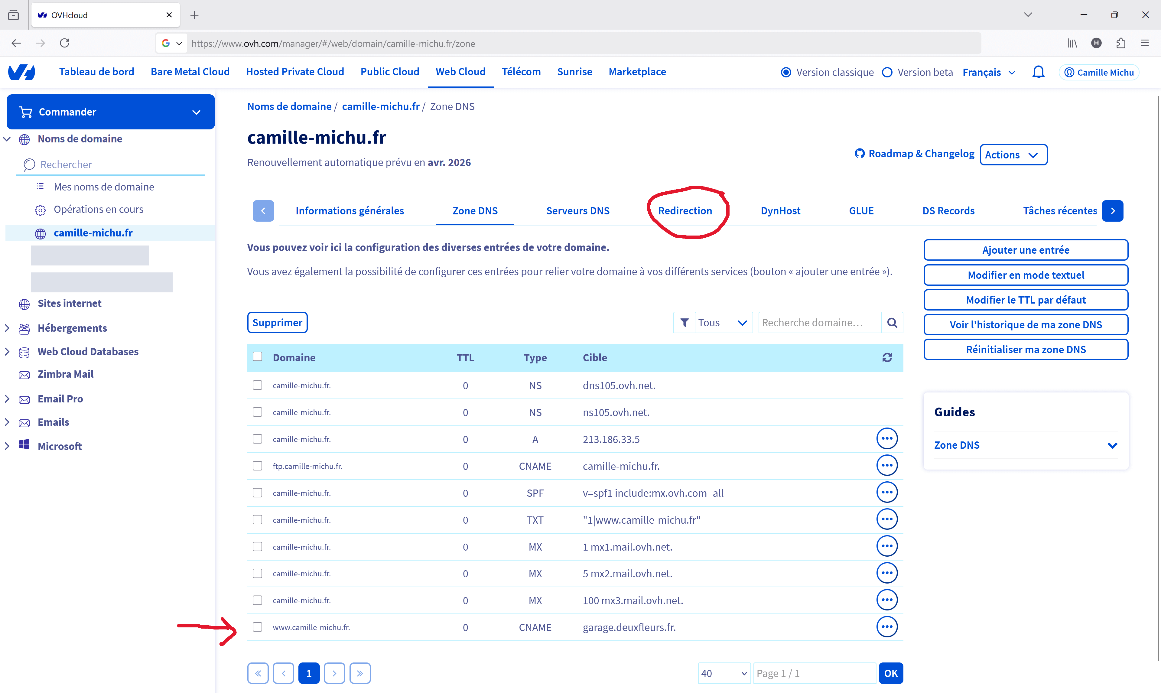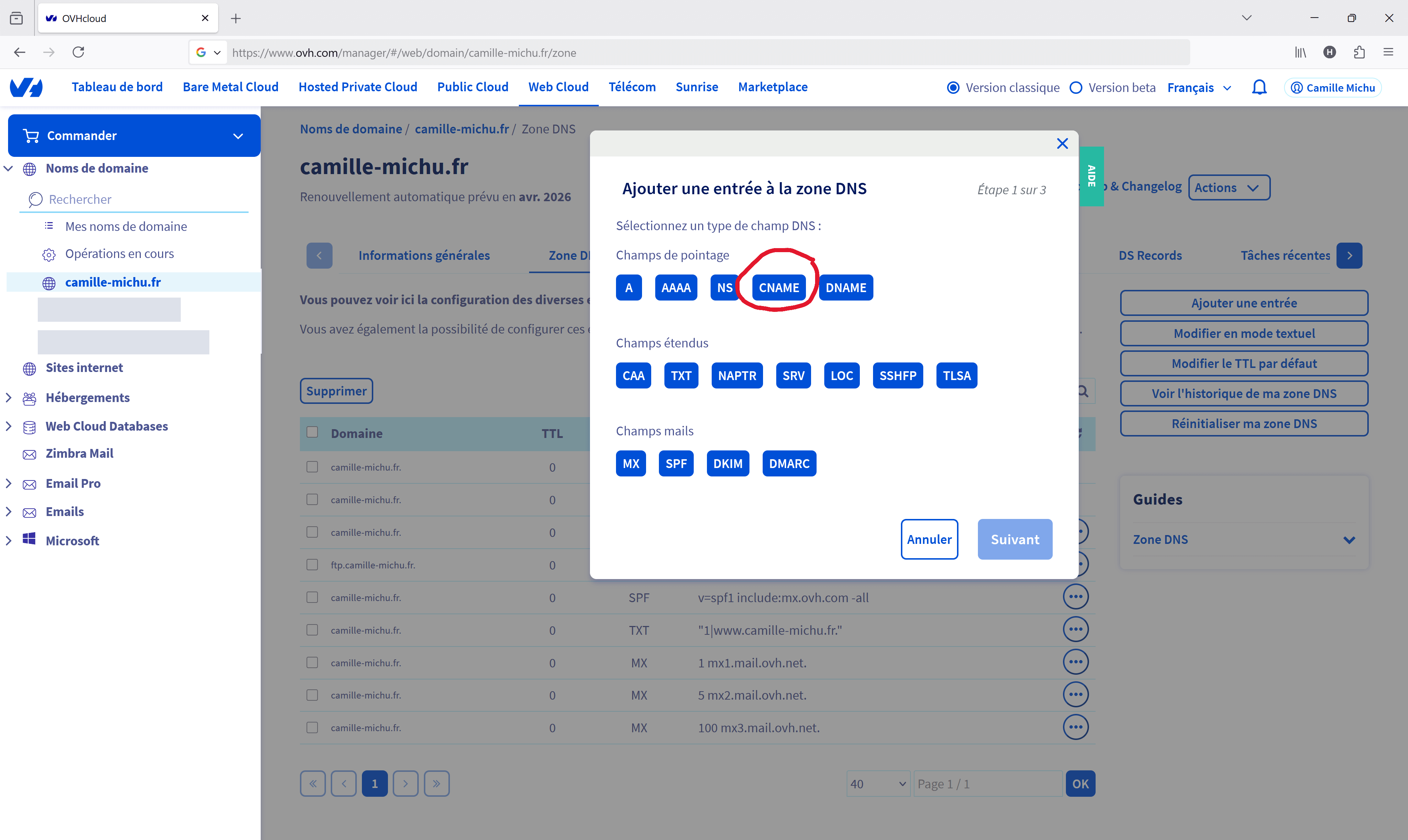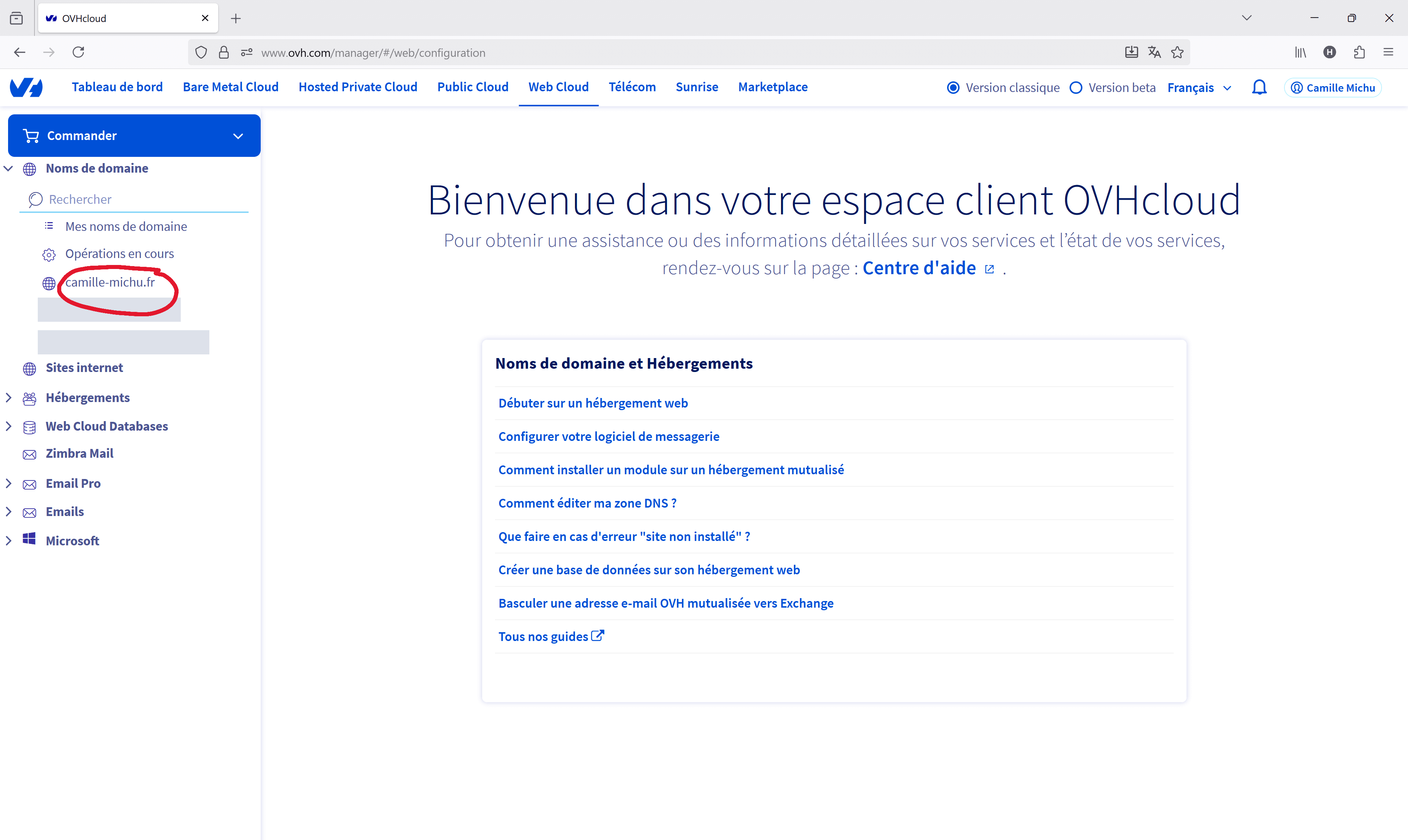 Dans la liste à gauche, cliquez sur "Noms de domaine" puis "camille-michu.fr". :