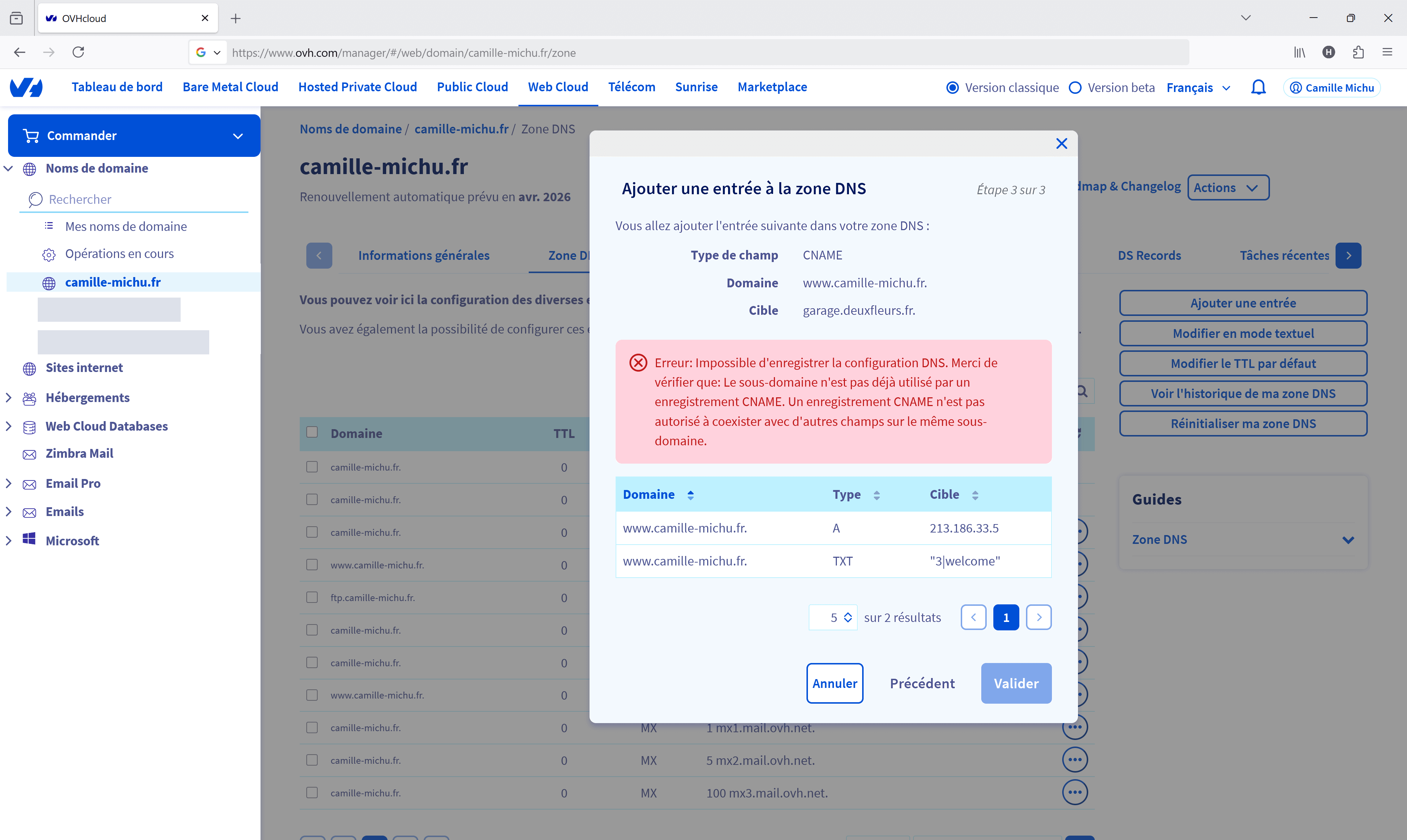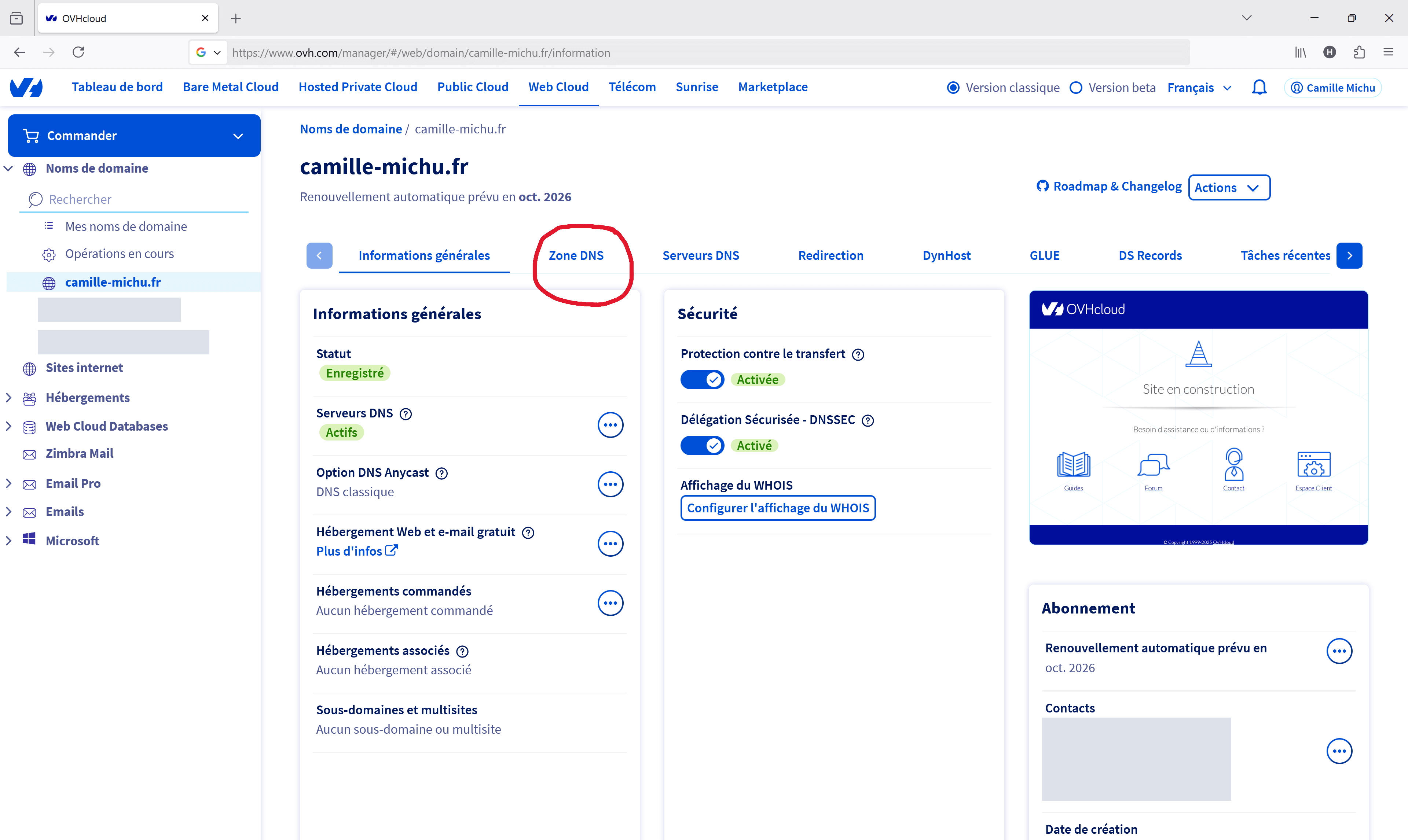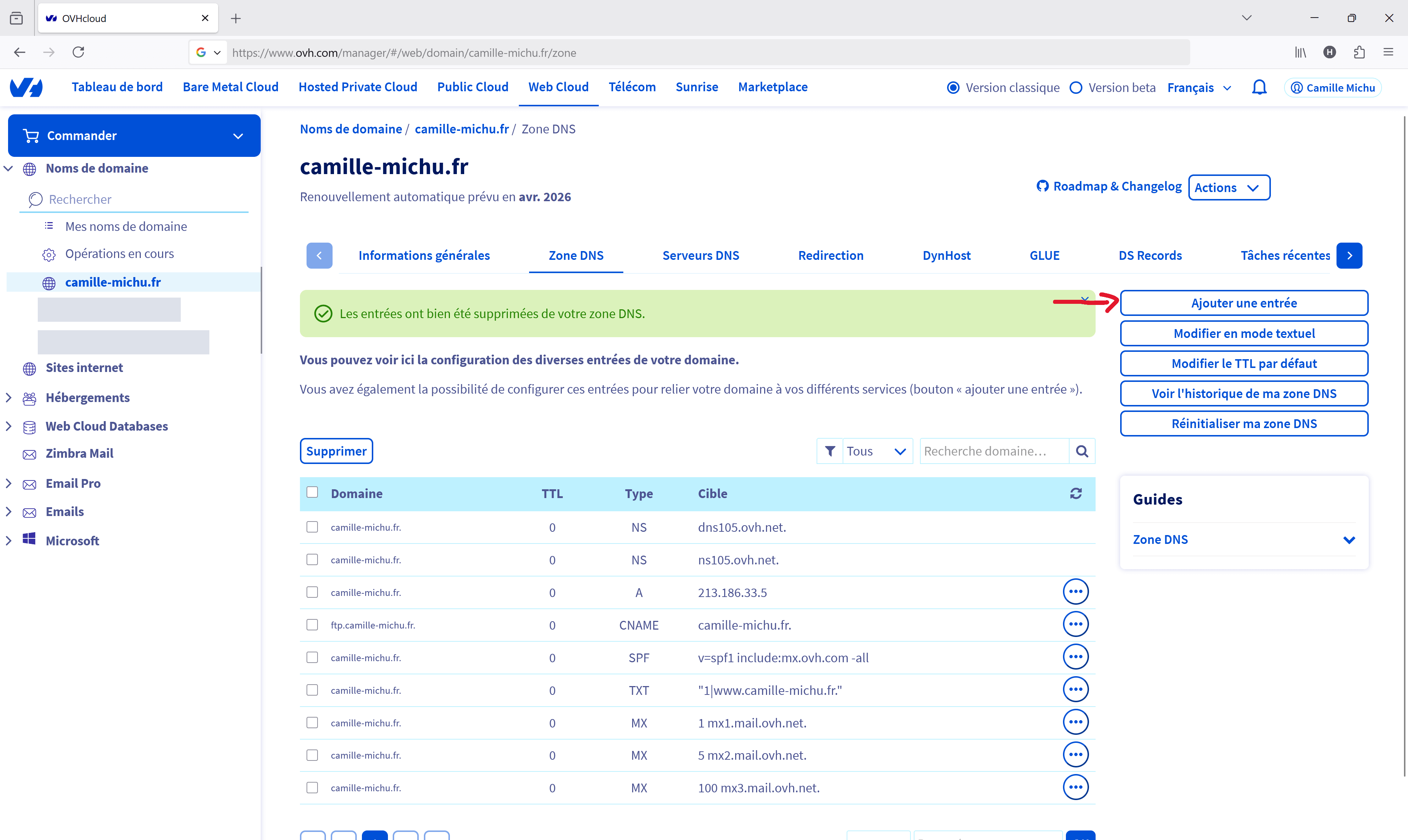 Dans la liste à gauche, cliquez sur "Noms de domaine" puis "camille-michu.fr". :