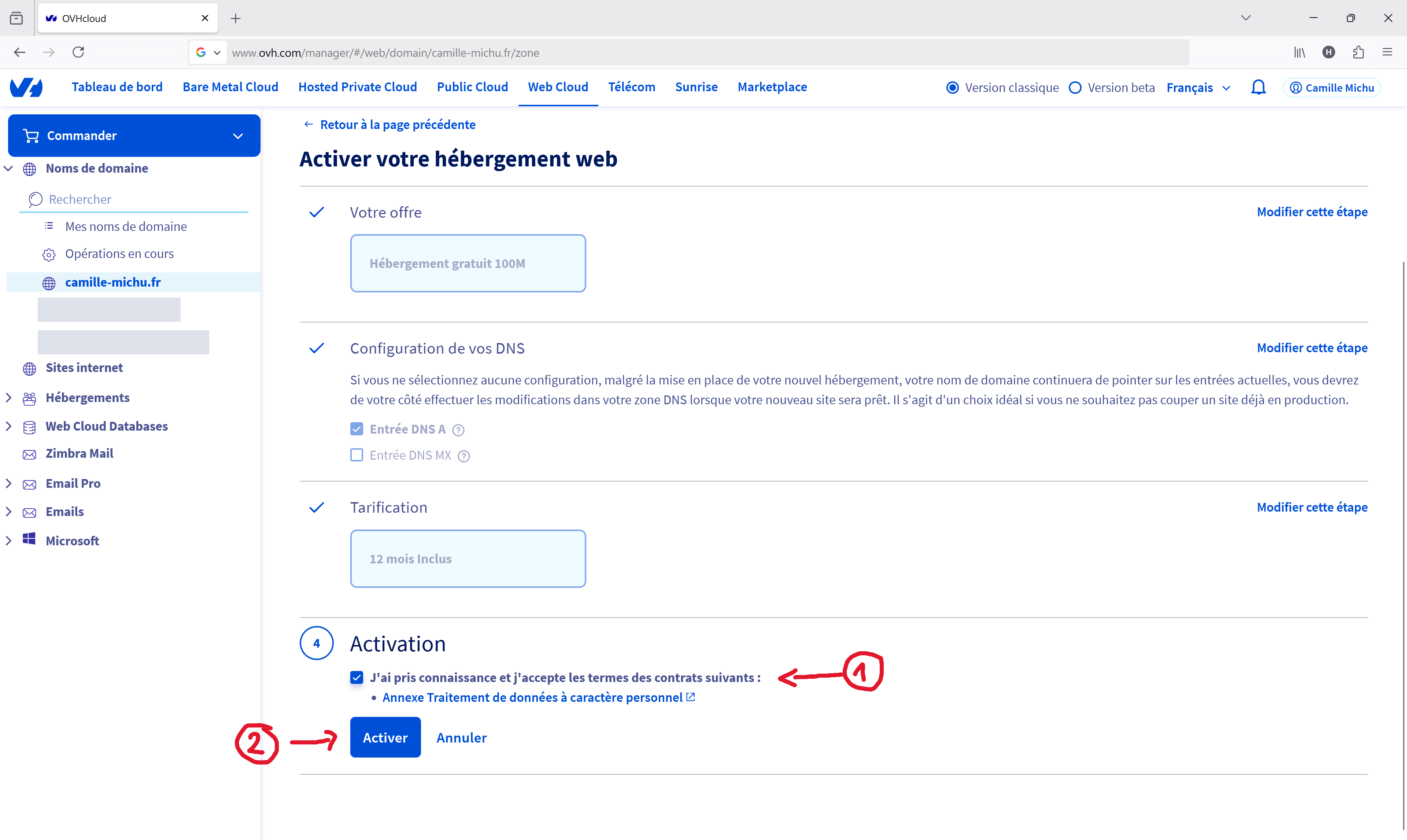Sélectionnez "camille-michu.fr" dans la liste et vérifiez que l'hébergement est actif :