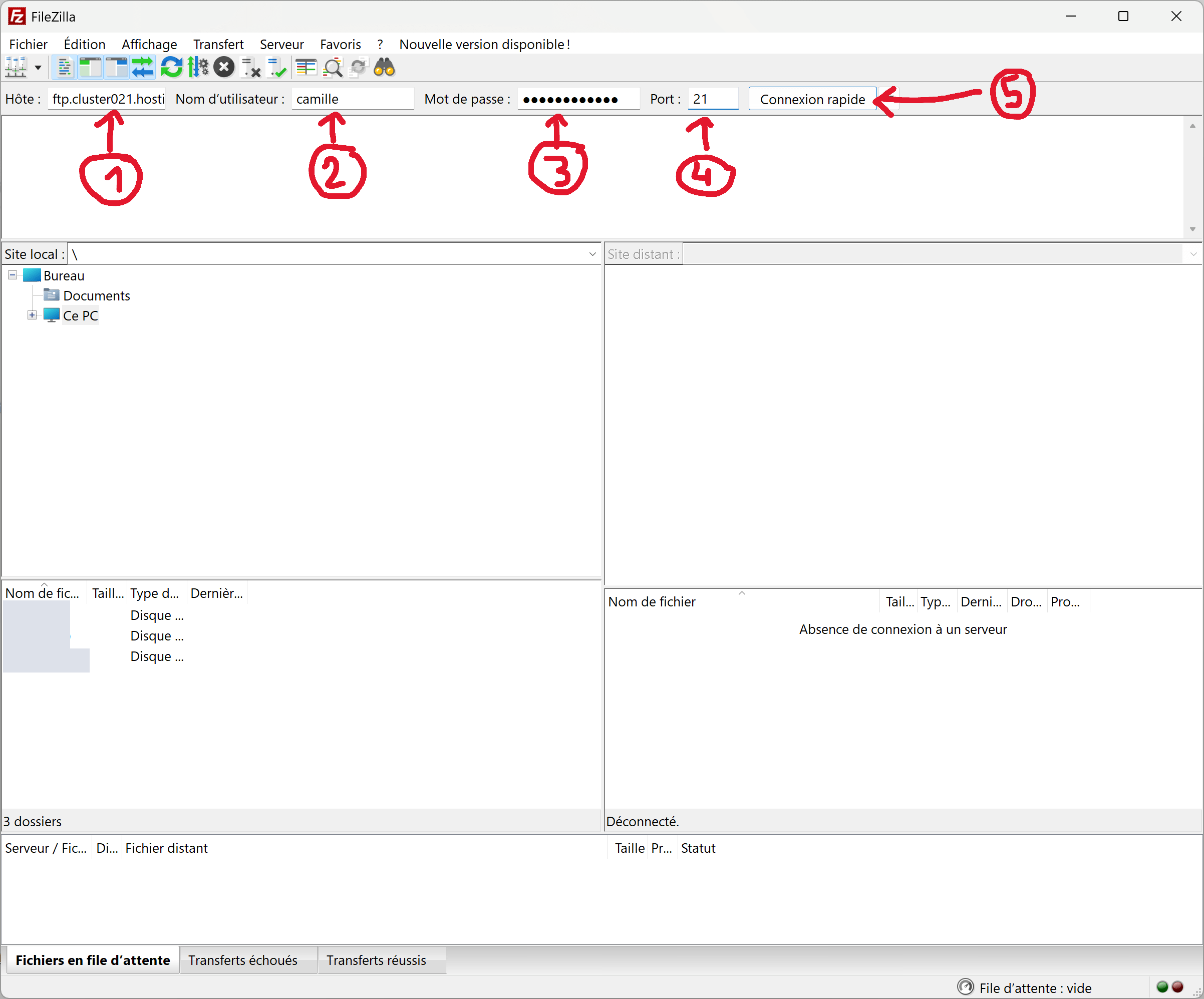 Ouvrez votre logiciel de transfert de fichier préféré et remplissez les champs comme indiqué dans l'email que vous avez reçu. Cliquez sur "Connexion" :