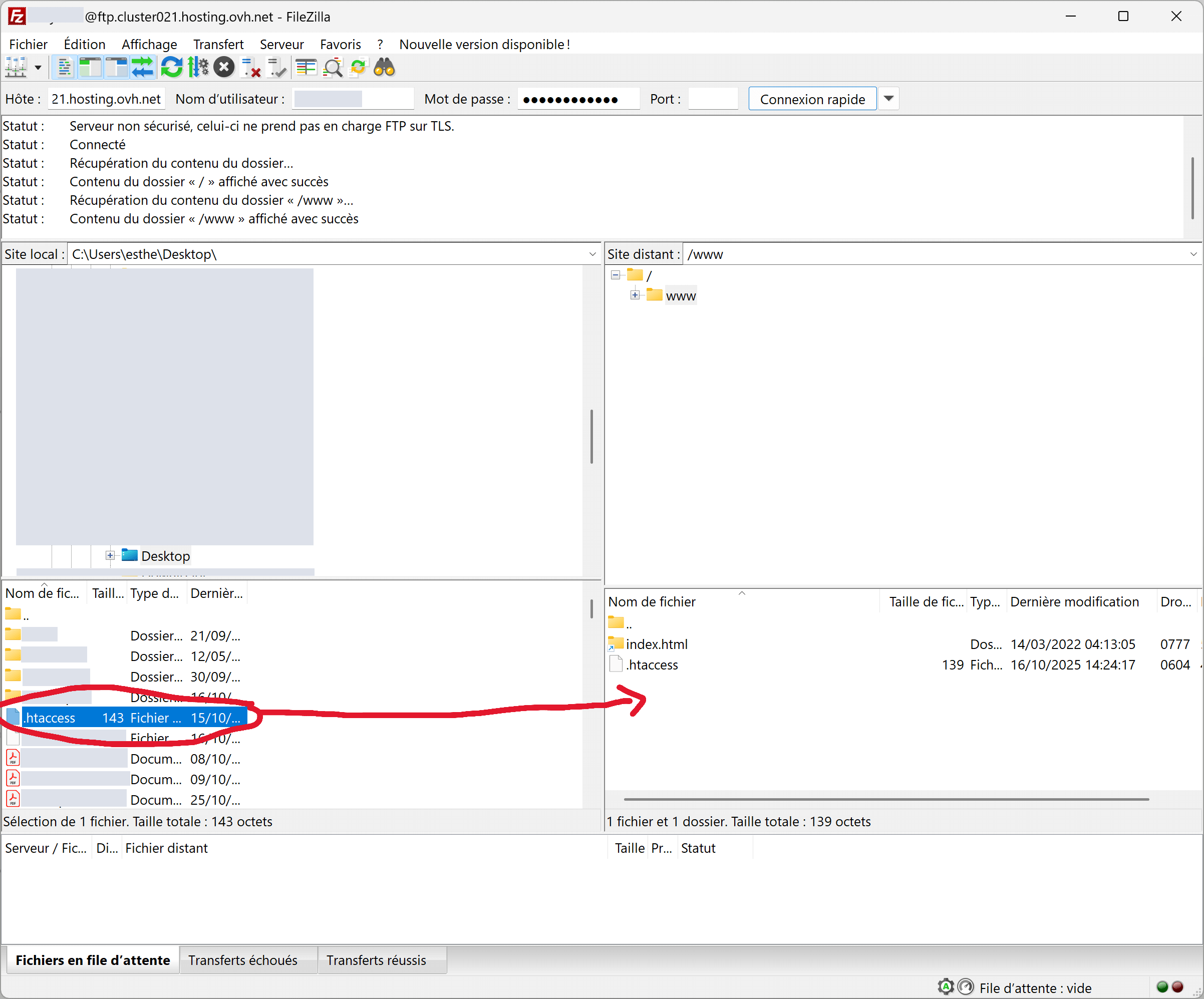 (que vous avez soit créé soit téléchargé) puis glissez-déposez le fichier sur le site distant. Cliquez sur "Remplacer" si un fichier .htaccess